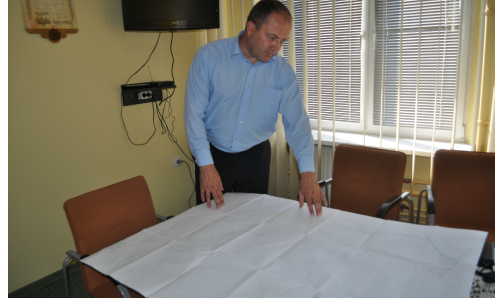 Starosta Henryk Kiepura rozkłada na dużym biurku plan geodezyjny.