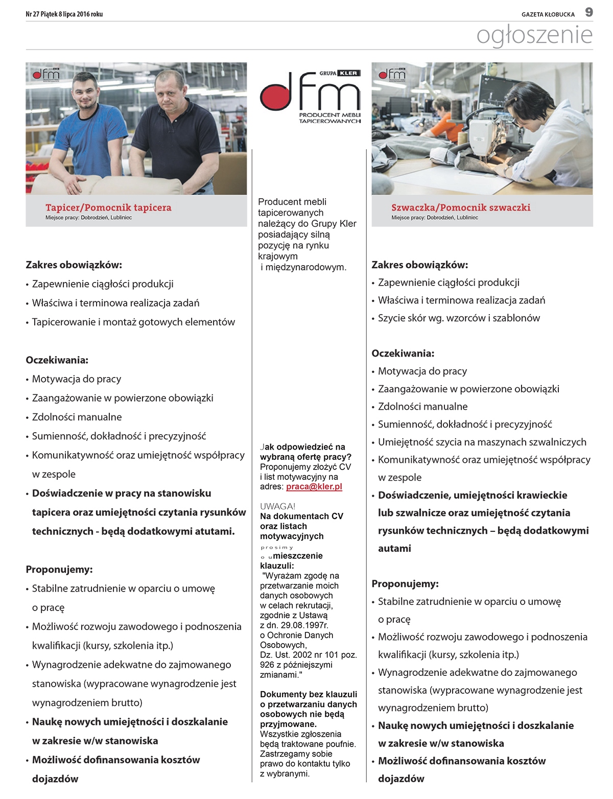 Producent mebli tapicerowanych należący do Grupy Kler poszukuje pracowników