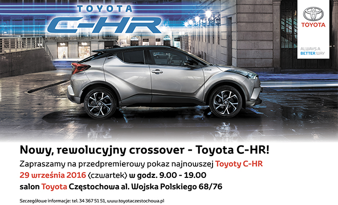 Ten wyjątkowy model japońskiego producenta możecie zobaczyć już 29 września (czwartek) w godz. 9.00-19.00 w Salonie Toyota Częstochowa al. Wojska Polskiego 68/76