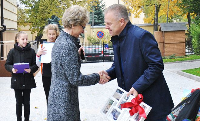 Burmistrz z rąk dyrektor szkoły, w imieniu nauczycieli i rodziców, otrzymał zdjęcia w oprawie, dokumentujące poszczególne etapy budowy boiska.