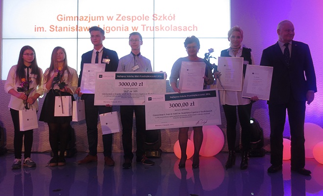 Najlepszych w Polsce nauczycieli przedsiębiorczości oraz najlepsze w tej dziedzinie szkoły i szkolne kluby przedsiębiorczości jak co roku wyróżniono w siedzibie NBP w Warszawie. Wśród gimnazjów z całej Polski pierwsze miejsce otrzymało Gimnazjum w Zespole Szkół im. Stanisława Ligonia w Truskolasach. Już po raz drugi. Najlepszym Szkolnym Klubem Przedsiębiorczości został ten działający w Truskolasach. Z kolei tytuł najlepszego nauczyciela przedsiębiorczości przyznano paniom Grażynie Kołacz i Marlenie Macherzyńskiej, nauczycielkom z Truskolas. To potrójne pierwsze miejsce w kraju to nie wszystko. Nauczycielki zostały też nagrodzone za pierwsze miejsce w konkursie na projekt według autorskiego scenariusza. Jak uważni czytelnicy mogli już przeczytać na naszych łamach w toku realizacji projektu, nosił on tytuł „Niezależność TAK, Bezrobocie NIE!”.