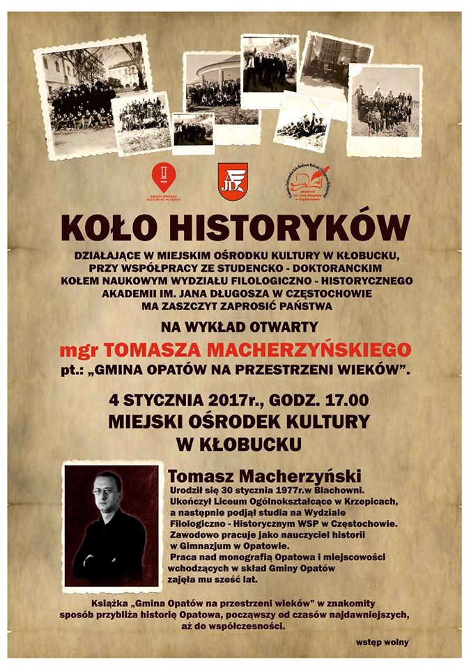 Kliknij, aby powiększyćWykład pt.: „Gmina Opatów na przestrzeni wieków” odbędzie się 4 stycznia 2017r. o godz. 17.00 w Miejskim Ośrodku Kultury w Kłobucku.