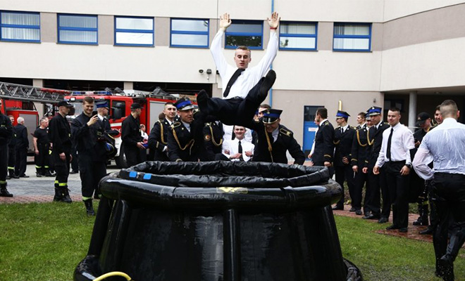 WYDARZENIE. W piątek na terenie Centralnej Szkoły Państwowej Straży Pożarnej odbył się uroczysty apel z okazji Dnia Strażaka. Nie zabrakło przedstawicieli władz różnych szczebli. Nie zabrakło też kąpieli w basenie, które strażacy sprawili swoim odznaczonym kolegom