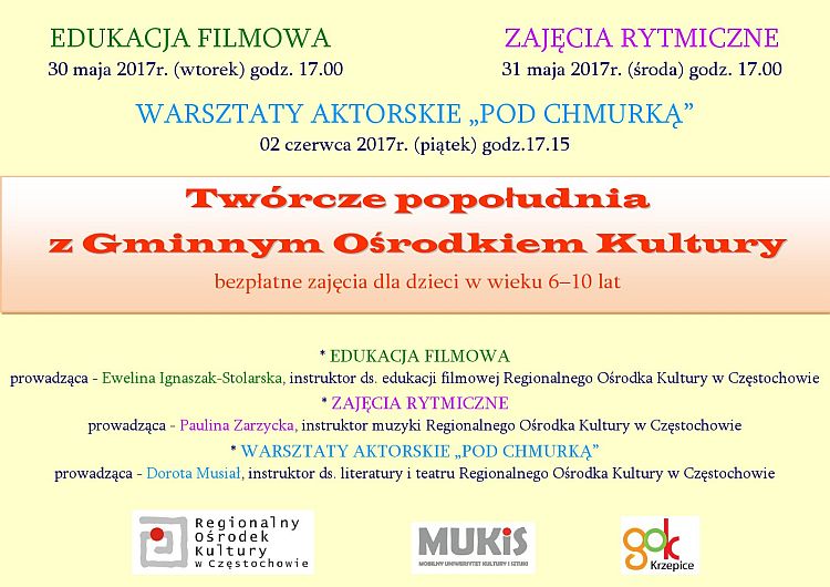 Na przełomie maja i czerwca GOK w Krzepicach zaprasza na „Twórcze popołudnia”. To bezpłatne zajęcia dla dzieci w wieku 6-10 lat, które poprowadzą instruktorzy z Częstochowy. W ramach przewidzianych zajęć będzie edukacja filmowa (30 maja), zajęcia rytmiczne (31 maja) i warsztaty aktorskie (2 czerwca). Zajęcia odbędą się w godzinach popołudniowych (od 17.00 i, ostatnie, od 17.15).
