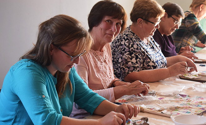 Tym razem uczestniczki sekcji rękodzieła artystycznego dla osób dorosłych poznały metodę dekupażu. „Decoupage” nawiązuje swą francuską nazwą do techniki wycinania – i wycinanie i naklejanie wyciętych wzorów jest podstawą tej metody zdobniczej. Uczestniczki warsztatów zdobiły w ten sposób drewniane deski kuchenne.