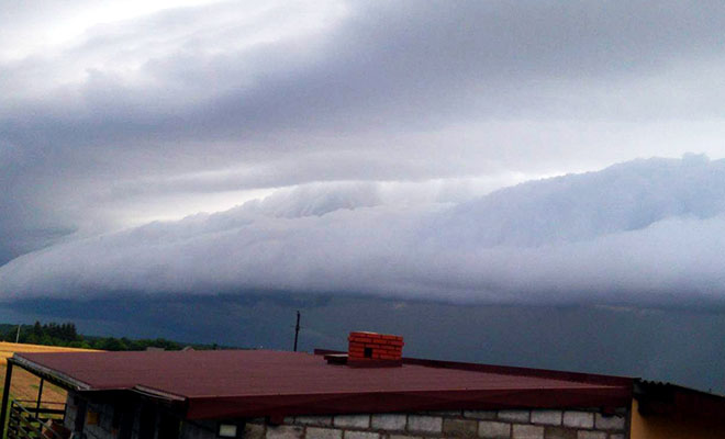 Wał szkwałowy zwany też chmurą szelfową formuje się na przedzie i u podstawy dużych chmur burzowych. To zjawisko tyleż majestatycznie piękne, ile budzące grozę, bo zwykle poprzedzające nadejście silnej burzy (zdjęcie z gminy Lipie). BARTOSZ ZYMŁA