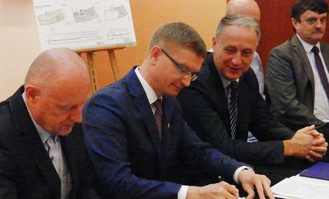 Wyniki przetargu podaliśmy już prawie dwa miesiące temu TUTAJ . Urząd miasta wybrał wówczas ofertę opiewającą na 51,5 mln zł, którą złożyło konsorcjum firm Cz.P.B.P. Przemysłówka S.A. oraz Karol Pilchowiec Zakład Remontowo-Budowlany KAR-BUD w Częstochowie. Ponieważ od wyniku postępowania odwołały się jednak dwie inne firmy, do momentu rozstrzygnięcia sprawy przez Krajową Izbę Odwoławczą niemożliwe było podpisanie umowy. Nastąpiło to dopiero dzisiaj – w budynku Odwachu (obok Ratusza Miejskiego) – z przedstawicielami wspomnianego konsorcjum.