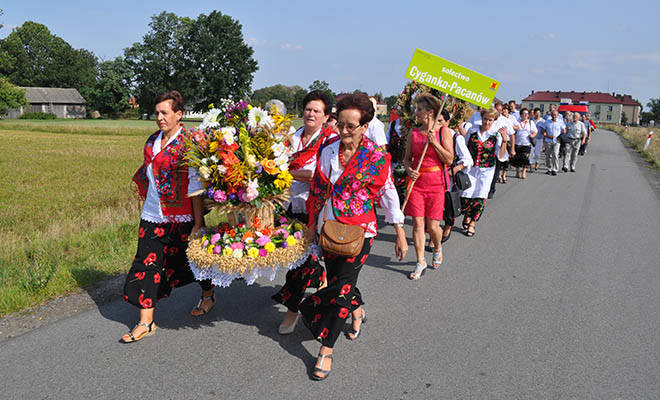 Po mszy świętej tradycyjny korowód z wieńcami dożynkowymi, choć w tym roku bez orkiestry dętej na czele, przeszedł ulicami Panek na teren placu koło hali sportowej. Tu w ramach zwyczajowych ceremonii starostowie dożynkowi przekazali na ręce wójta chleb z mąki zbóż zebranych w tym roku. Drugi bochen – ukraiński korowaj – złożyła na ręce wójta Bogdana Praskiego goszcząca w Pankach mer Jagodzina na Ukrainie, Natalia Dziuba. Zapowiedziano publicznie podpisanie umowy partnerskiej między Pankami i Jagodzinem, padły też miłe słowa gościa o naszych tradycjach i o tym, że są one bliskie tym praktykowanym także u naszego sąsiada ze Wschodu.