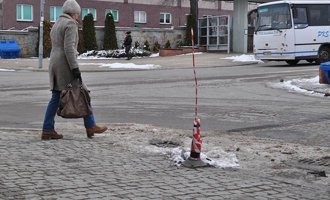 PROBLEM. Blisko rogu rynku w tej chwili z chodnika sterczy kikut, który pozostał po zdemontowaniu przewróconej latarni. W poniedziałek wieczorem młody kierowca urządził sobie szybką jazdę wokół rynku. Jest ślisko. Nie wyrobił się na zakręcie