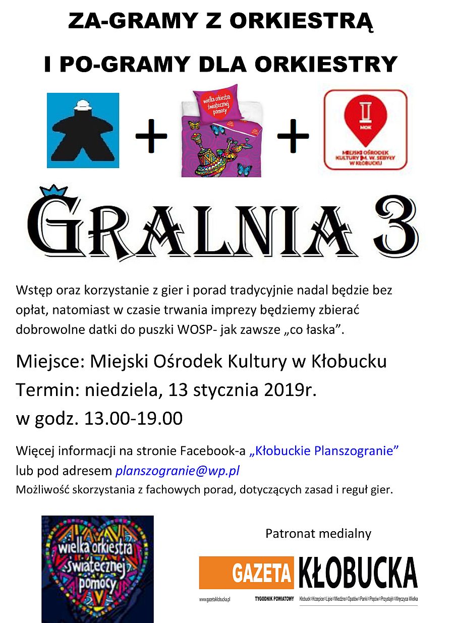 Gralnia 3 – czyli trzecie już Kłobuckie Planszogranie, podczas którego można wkroczyć w świat nowoczesnych, inteligentnych gier planszowych – połączona będzie ze zbiórką na rzecz Wielkiej Orkiestry Świątecznej Pomocy. Odbędzie się więc w dniu jej wielkiego finału – w niedzielę 13 stycznia między 13.00 a 19.00 w Miejskim Ośrodku Kultury we Kłobucku