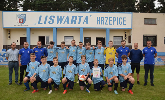 Zwycięska drużyna Liswarty Krzepice z trenerem Jakubem Troczką i klubowymi działaczami.