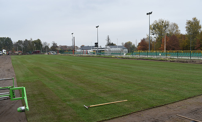 Odwodnienie i nawodnienie gotowe, stoją już dwa z czterech masztów oświetleniowych na głównym boisku Ośrodka Sportu i Rekreacji w Kłobucku. Aktualnie trwa rozkładanie trawy na płycie głównej.