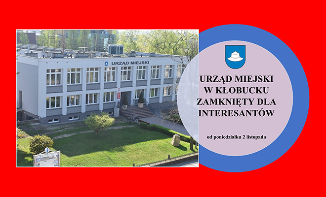W związku ze zwiększoną ilością odnotowanych przypadków zachorowań na COVID-19 informujemy, że Urząd Miejski w Kłobucku (ul. 11 Listopada 6 oraz ul. Zamkowa 12) od dnia 2 listopada 2020 roku zostaje zamknięty dla interesantów do odwołania.