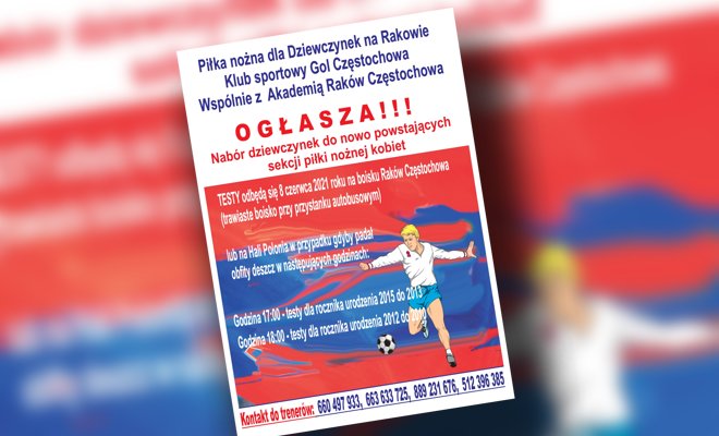 Klub Sportowy Gol Częstochowa wspólnie z Akademią Raków Częstochowa prosi o przekazanie rodzicom i uczennicom w miarę posiadanych możliwości informacji zawartej w plakacie ( w załączeniu ). Zapraszamy dziewczynki z roczników 2015 do 2009 na testy do nowo powstających sekcji piłki nożnej kobiet , które odbędą się 8 czerwca o godzinie 17.00 i 18.00 na stadionie Raków Częstochowa. Telefony do trenerek/ów 663633725, 889231676, 660497933.