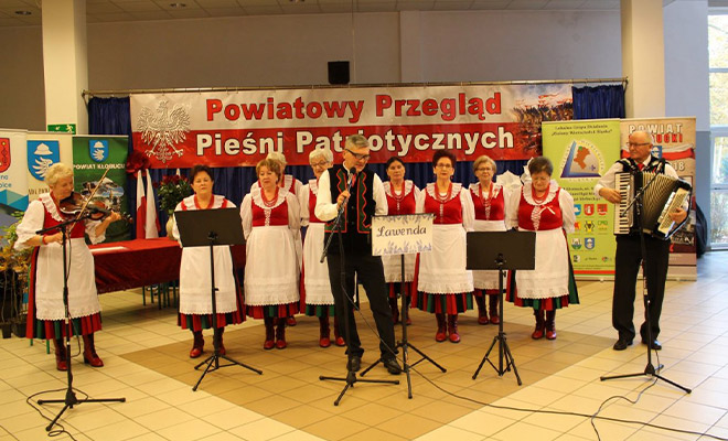 Pieśni patriotyczne śpiewały zespoły kół gospodyń. Wbrew pozorom często słychać w nich też głosy męskie.