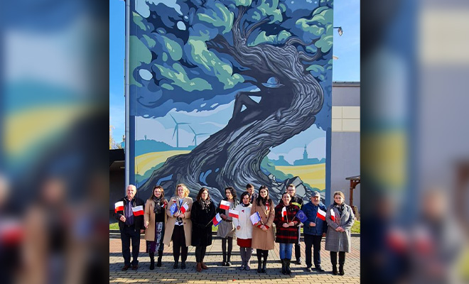 Mural odsłonięto w przeddzień Narodowego Święta Niepodległości. Zdobi dobrze widoczną ścianę MOK-u, dotąd zajmowaną zwykle pod wielkopowierzchniowe reklamy. (jar)