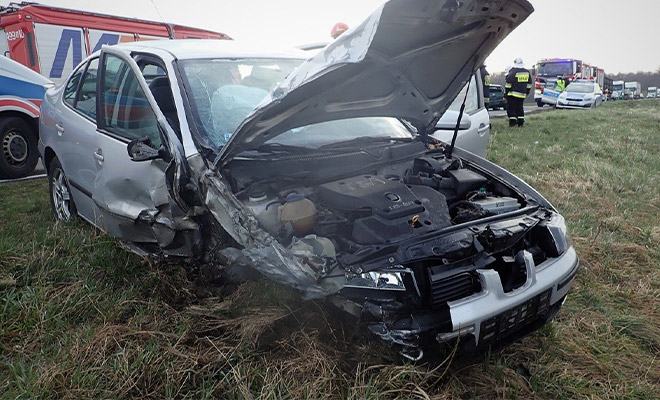 Zderzenie dwóch aut osobowych nastąpiło blisko wyprzedzanej przez seata ciężarówki marki Scania. Odrzucony prawdopodobnie siłą kolizji volkswagen polo uderzył jeszcze w tę właśnie scanię.