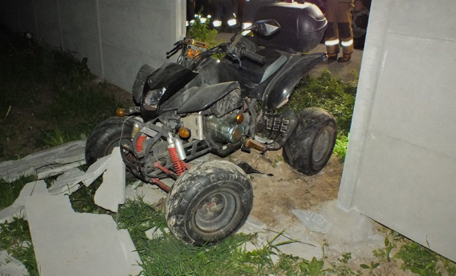 POLICJA. Na bocznej, spokojnej ulicy mężczyzna wjechał quadem w płot z płyt betonowych. Potrzaskał ogrodzenie i siebie. Policja nie mogła zbadać na miejscu, czy był trzeźwy