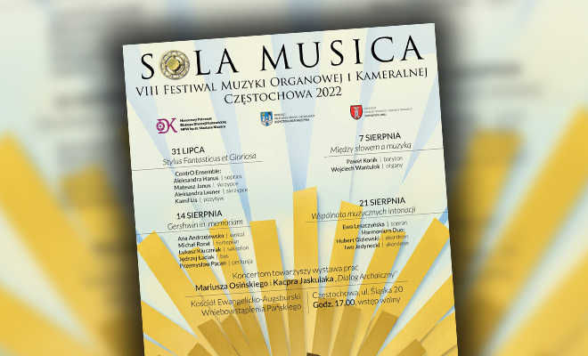 Zapraszamy na wakacyjny cykl czterech koncertów w ramach VIII Festiwalu Muzyki Organowej i Kameralnej SOLA MUSICA, które odbędą się w Kościele Ewangelicko-Augsburskim w Częstochowie.