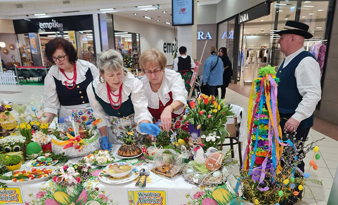 W ubiegłą niedzielę w częstochowskiej galerii handlowej o świąteczną atmosferę zadbały Wręczynki Plus – panie aktywne w ramach KGW Wręczyca Wielka. Zespół zaprezentował półgodzinny koncert, a do tego przygotował stół zastawiony wielkanocnymi smakołykami. Nie zabrakło na nim swojskich produktów. Udział w konkursie był udany. Wręczynki zajęły w nim drugie miejsce. (jar)