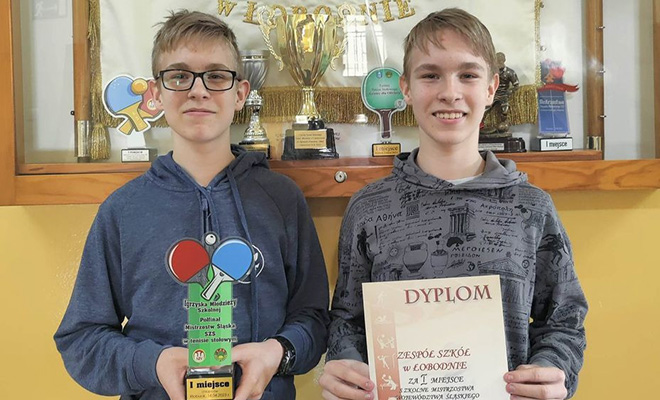 Dwaj uczniowie szkoły w Łobodnie, Mateusz i Łukasz Wydmuchowie, fantastycznie reprezentowali nas w rozgrywkach na wysokim szczeblu Igrzysk Młodzieży Szkolnej. Przepustką do rozgrywek wojewódzkich było dla nich pierwsze miejsce w Igrzyskach Młodzieży Szkolnej w tenisie stołowym chłopców w zawodach rejonowych w Kłobucku. Następnie bracia Wydmuch wywalczyli jako drużyna ZSP w Łobodnie pierwsze miejsce w półfinale Wojewódzkich Igrzysk Młodzieży Szkolnej w tenisie stołowym. W finale w Koziegłowach zajęli miejsce drugie – w stawce bardzo dobrych drużyn, reprezentujących na ogół największe miasta naszego województwa. Pokazali, że także u nas są sportowe talenty i tenisiści zdolni rywalizować na najwyższym poziomie w swej kategorii wiekowej.