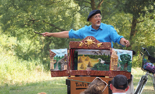 To byłoby w zasadzie nierealne – ale było możliwe, bo teatr też niezwykły. Kilka dni temu Gminne Centrum Kultury miało zaszczyt gościć Teatr Miejsca – Robert Poryziński. Działo się to w Zawadach, przy Bujanym Mostku. Zaparkował tam wyjątkowy „rower cargo”, z którego aktor – opowiadacz wypakował swoje bagaże, a następnie zbudował scenę. Po to, by przekazać widzom „Opowieści Papierowego Teatru” na podstawie baśni H.Ch. Andersena: „Dzielny Ołowiany Żołnierz”, „Brzydkie Kaczątko” i „Dyrektor Teatru Marionetek”.