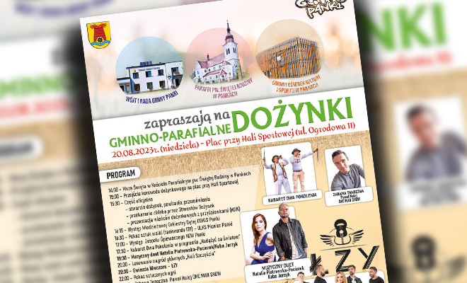 Dożynki odbędą się na placu przy hali sportowej, czyli w zwykłym od kilku lat miejscu. Wcześniej jednak, o 14.00, w kościele w Pankach odprawiona zostanie msza święta z dziękczynieniem z a plony. Około 15.00 korowód dożynkowy przejdzie na plac pod halą sportową. Tu część oficjalna rozpocznie się o godzinie 15.30. Przewidziane są wówczas zwyczajowe dożynkowe ceremonie. Między innymi przekazanie chleba i prezentacja wieńców. Kwadrans po czwartej po południu rozpoczną się występy sceniczne. Najpierw zagra orkiestra dęta z Panek. Potem – pokaz taekwon-do. Zaśpiewają też panie z koła gospodyń i będzie występ kabaretowy. Na godzinę 20.30 zapowiedziany jest występ gwiazdy wieczoru. Będzie nią zespół Łzy. Wieczór zakończy pokaz sztucznych ogni, a następnie zabawa taneczna. (jar)