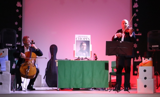 Nazajutrz w szkole po raz pierwszy odbyły się koncerty duetu smyczkowego, który tworzą Krzysztof Orzechowski (wiolonczela) i Wojciech Marcinowski (skrzypce, altówka). Pierwszy – „Jedzie pociąg z daleka” – skierowany był do uczniów klas I-IV, drugi – „Smyczkowanie na śniadanie” – do uczniów klas V-VIII. Wirtuozi oprócz prezentowania utworów muzycznych zabawiali publiczność ciekawymi historiami i opowieściami. Uczniowie mogli na koniec wziąć udział w muzycznym quizie z nagrodami, polegającym na rozpoznawaniu motywów muzycznych odgrywanych na skrzypcach.