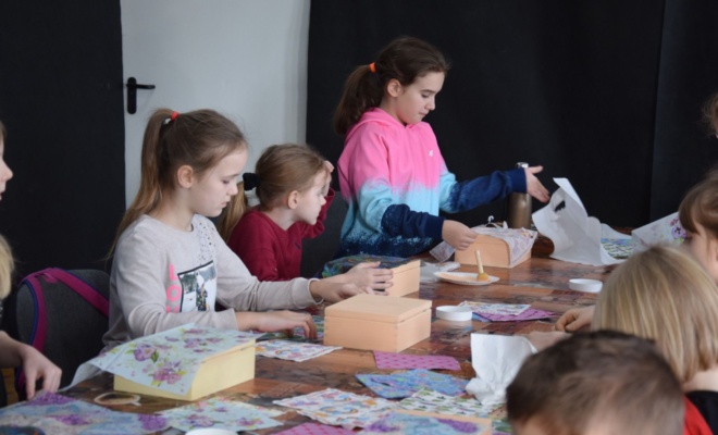Od samego rana sala wypełniła się dziećmi, które z zapałem ozdabiały drewniane pudełka, starannie dobierając motywy, kolory i materiały. Wśród nich znalazły się zarówno subtelne kwiatowe wzory, jak i odważniejsze kompozycje. Każde pudełko, które powstało, było unikalne – dowód na to, jak wiele pomysłów kryje się w młodych artystach. Technika decoupage polega na naklejaniu papierowych wzorów na różne powierzchnie, co daje efekt niezwykłych ozdób. Dzieci z łatwością opanowały tę metodę, pod czujnym okiem instruktorów, którzy nie tylko służyli pomocą, ale także inspirowali do coraz bardziej ambitnych projektów.