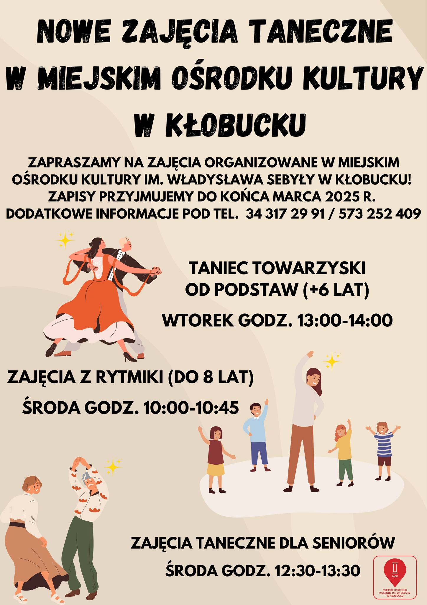Miejski Ośrodek Kultury w Kłobucku ogłasza rozpoczęcie zapisów na nowe zajęcia taneczne, które będą odbywać się w różnych grupach wiekowych. Zajęcia te mają na celu rozwój umiejętności tanecznych oraz zapewnienie aktywności fizycznej dla wszystkich zainteresowanych, niezależnie od wieku. Zapisy prowadzone są do końca marca.