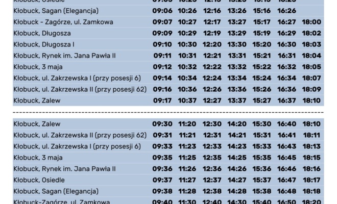 Autobus będzie kursował w soboty, niedziele i dni ustawowo wolne od pracy. Pierwszy kurs rusza z Rynku im. Jana Pawła II już o 9:04, a ostatni odjazd znad zalewu w stronę miasta zaplanowano na 18:24. Trasa prowadzi przez kluczowe punkty Kłobucka – m.in. Osiedle, Zakrzewską i ul. 3 Maja – umożliwiając mieszkańcom niemal każdej części miasta łatwe dotarcie nad wodę.