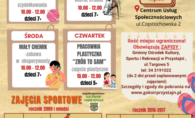 Ale organizatorzy zadbali nie tylko o kreatywny rozwój – ważnym elementem wakacyjnego programu są także zajęcia sportowe, przygotowane we współpracy z Klubem Sportowym „Płomień Przystajń”. Na najmłodszych, z roczników 2016 i 2017, czekają dwa spotkania: 1 lipca na stadionie przy ul. Bór 19 odbędzie się trening piłki nożnej 1×1, a 8 lipca – olimpijskie zmagania lekkoatletyczne. Dla starszych dzieci, urodzonych w 2009 roku i później, zaplanowano cztery sportowe wydarzenia: 7 lipca rozegrają mecze piłki nożnej 1×1, 10 lipca spróbują swoich sił w tenisie ziemnym w siedzibie GOKSiR przy ul. Targowej 5, 22 lipca wrócą na boisko na rozgrywki 6×6, a 24 lipca sprawdzą się w lekkoatletyce na szkolnym stadionie przy ul. Szkolnej 9.