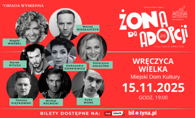 Gminny Ośrodek Kultury we Wręczycy Wielkiej zaprasza na znakomitą komedię teatralną pt. „Żona do adopcji”, która odbędzie się 15 listopada 2025 roku o godzinie 19:00.