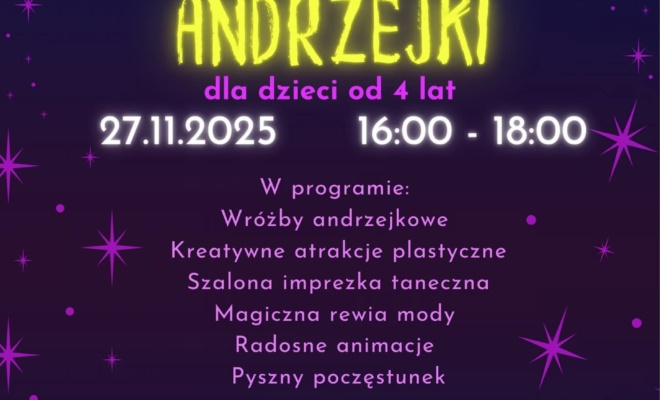 Podczas spotkania dzieci będą mogły wziąć udział w tradycyjnych wróżbach andrzejkowych, a także uczestniczyć w kreatywnych warsztatach plastycznych. Na uczestników czeka również szalona impreza taneczna, magiczna rewia mody, radosne animacje oraz pyszny poczęstunek.