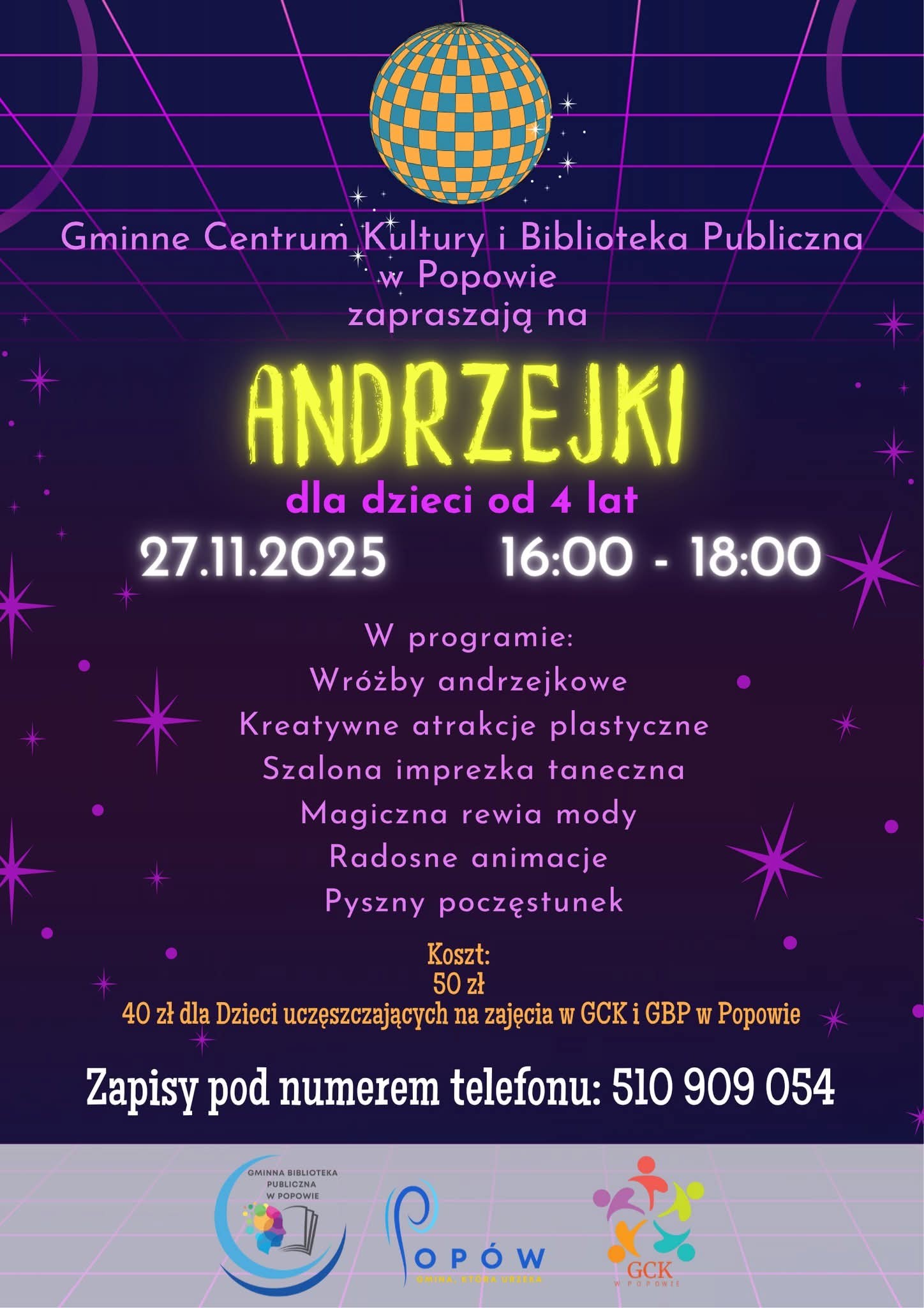 Koszt udziału w wydarzeniu wynosi 50 złotych, natomiast dzieci uczęszczające na zajęcia w GCK i GBP w Popowie zapłacą 40 złotych. Zapisy prowadzone są telefonicznie pod numerem 510 909 054.