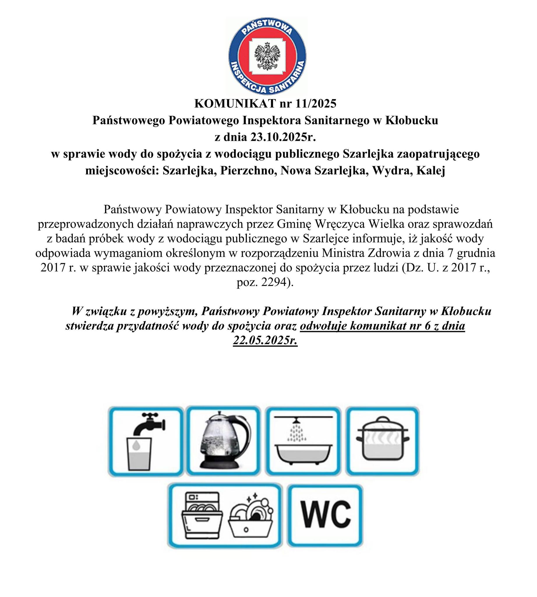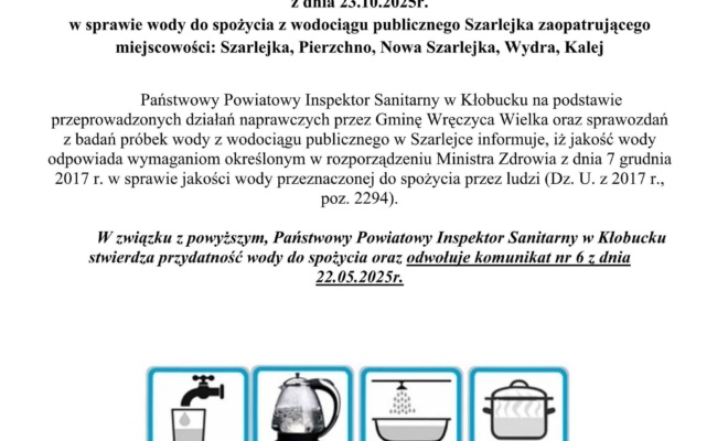 W związku z tym Państwowy Powiatowy Inspektor Sanitarny w Kłobucku stwierdził przydatność wody do spożycia i jednocześnie odwołał wcześniejszy komunikat nr 6 z 22 maja 2025 r.