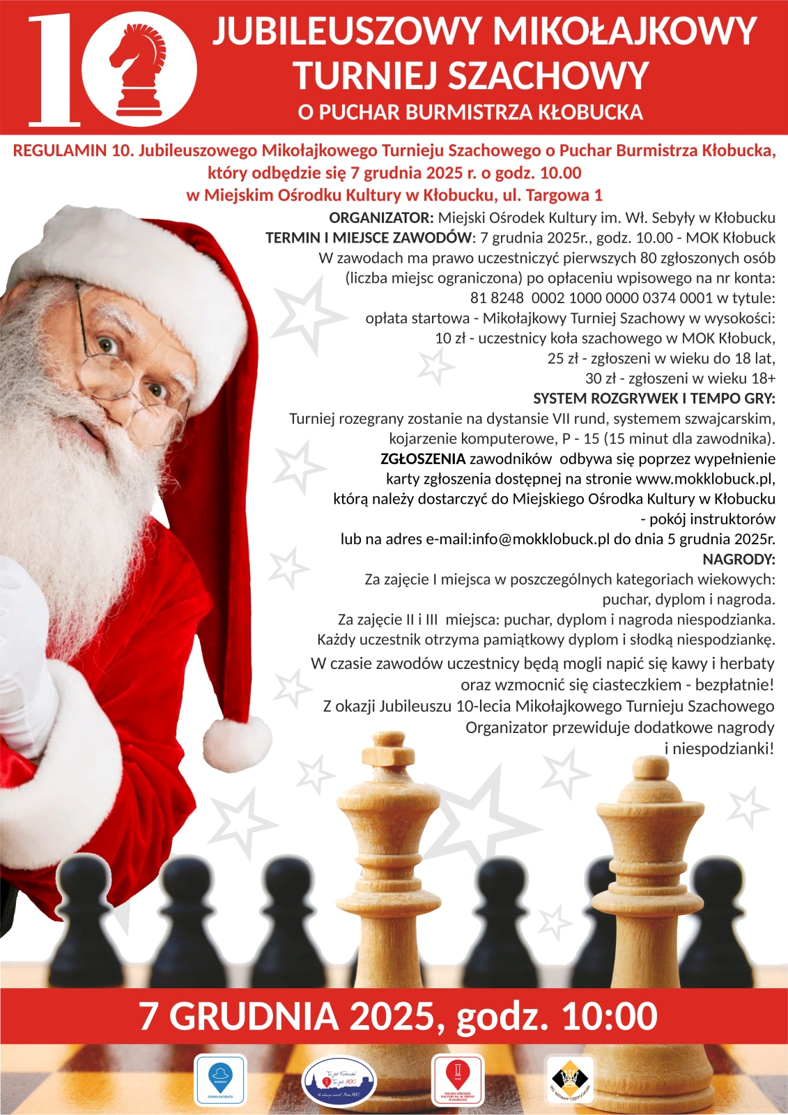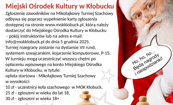 Miejski Ośrodek Kultury w Kłobucku zapowiada wyjątkowe wydarzenie dla miłośników królewskiej gry. Już 7 grudnia 2025 roku o godzinie 10:00 rozpocznie się 10. Jubileuszowy Mikołajkowy Turniej Szachowy o Puchar Burmistrza Kłobucka, który odbędzie się w siedzibie MOK.
