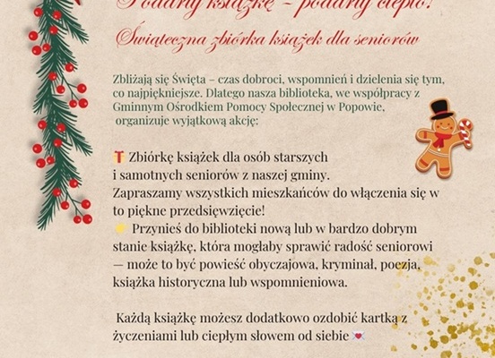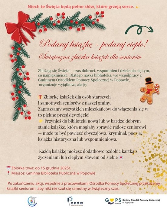 Zbliżające się święta to czas dzielenia się dobrem i radością. W tym duchu Gminna Biblioteka Publiczna w Popowie, we współpracy z Gminnym Ośrodkiem Pomocy Społecznej, organizuje wyjątkową świąteczną zbiórkę książek dla seniorów z gminy.