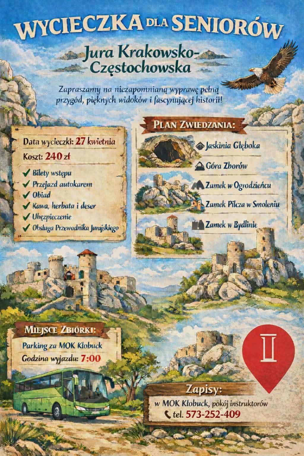 Miejski Ośrodek Kultury w Kłobucku zaprasza seniorów na wyjątkową wycieczkę po malowniczych zakątkach Jury Krakowsko-Częstochowskiej. Wyprawa odbędzie się 27 kwietnia 2026 roku, a punkt zbiórki zaplanowano na godzinę 7:00 na parkingu przy MOK Kłobuck.