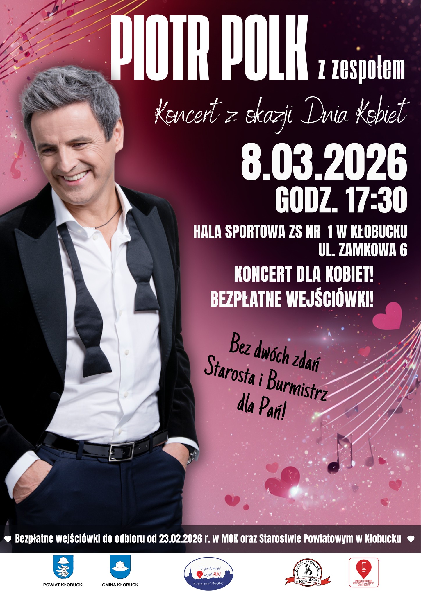 Bezpłatne wejściówki będą dostępne od 23 lutego 2026 roku w Miejskim Ośrodku Kultury w Kłobucku oraz w Starostwie Powiatowym w Kłobucku. Organizatorzy zachęcają do wcześniejszego odbioru biletów, aby nie przegapić tego wyjątkowego wieczoru.