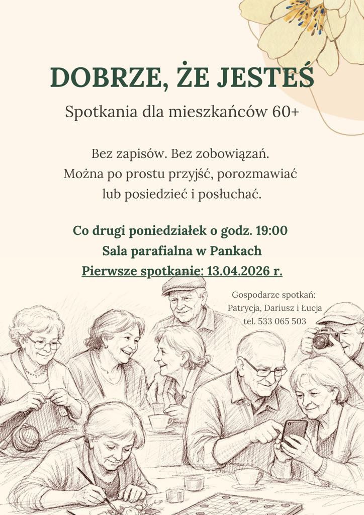 W Pankach rusza inicjatywa skierowana do mieszkańców w wieku 60+, która stawia na prostą, ale coraz bardziej potrzebną ideę – bycie razem. Pod hasłem „DOBRZE, ŻE JESTEŚ!” w sali parafialnej organizowany będzie cykl otwartych spotkań dla seniorów, oparty na rozmowie, wspólnym spędzaniu czasu i budowaniu sąsiedzkich relacji.
